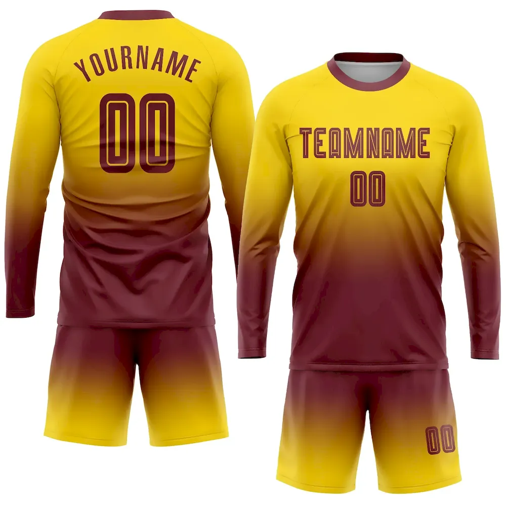 Custom Gold Burgundy Sublimation Long Sleeve Fade Fashion Soccer Uniform Jersey