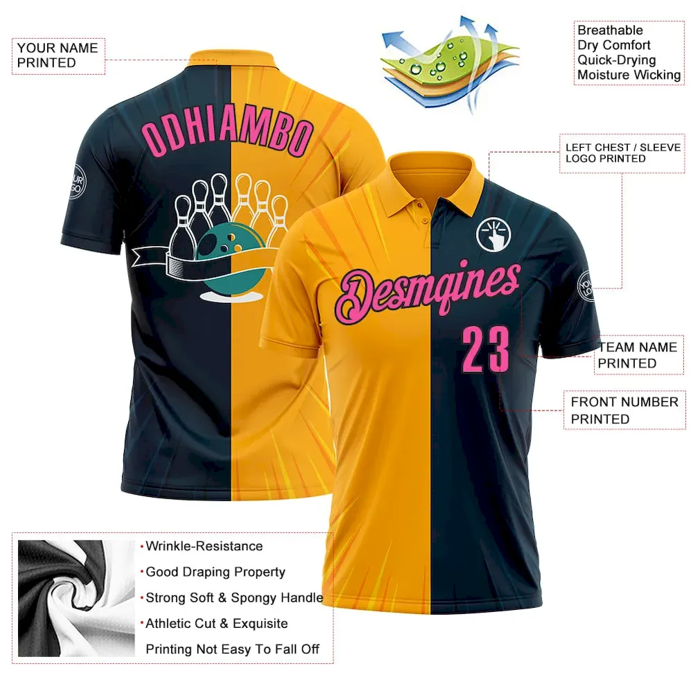 Custom Navy Pink Gold-Black 3D Bowling Performance Polo Shirt-kids